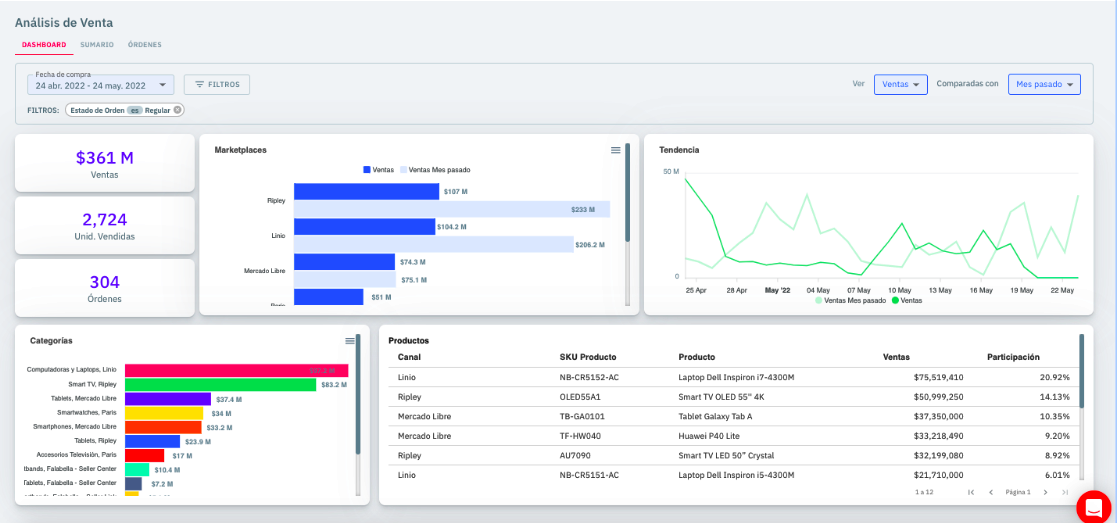Visualiza potentes dashboards de ventas de tus productos, categorías y marcas.